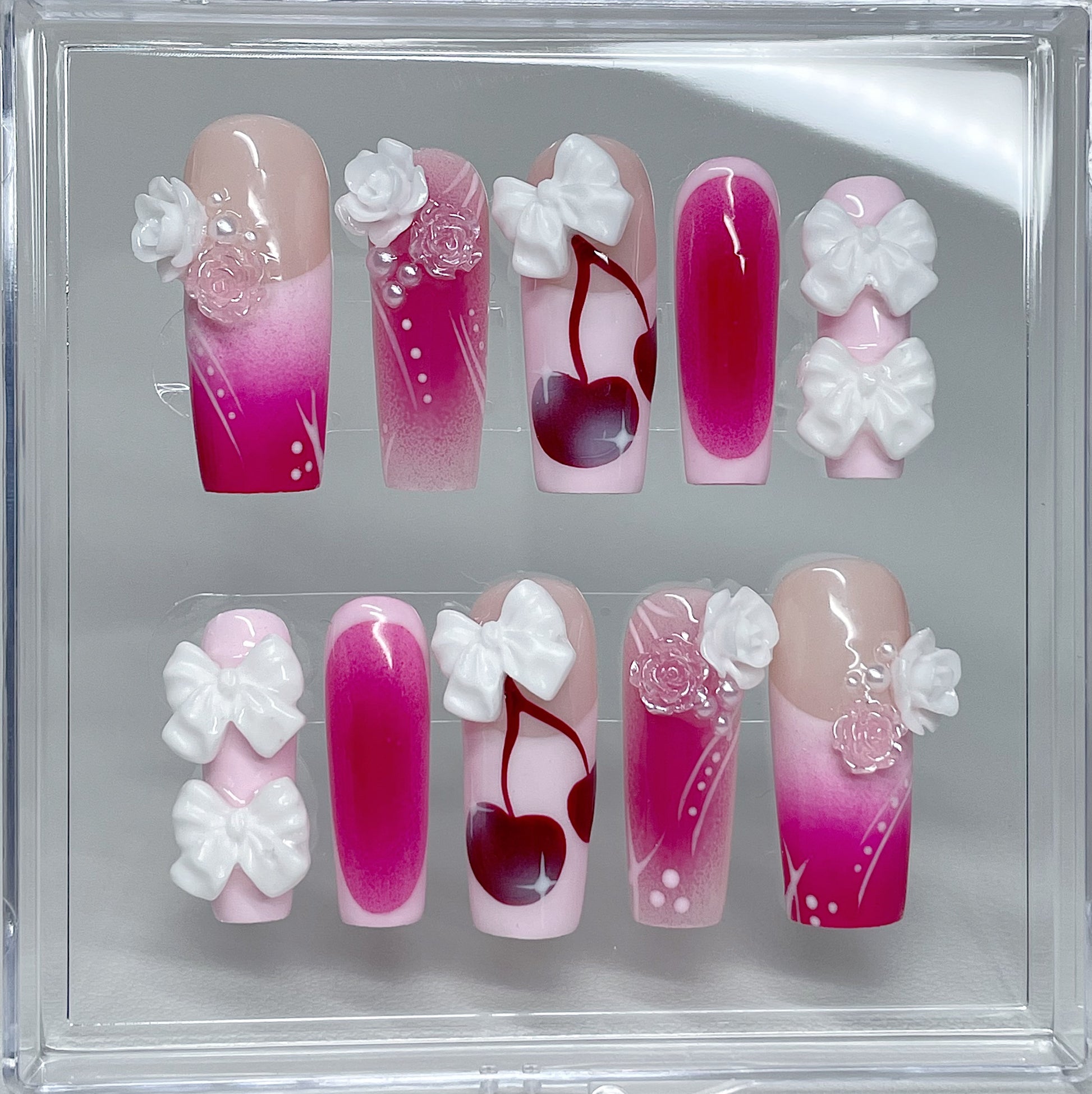 Your pressie set comes with 10 reusable press on nails as pictured, instructions on how to apply and remove your pressies, and an application kit containing everything you need for a seamless application!