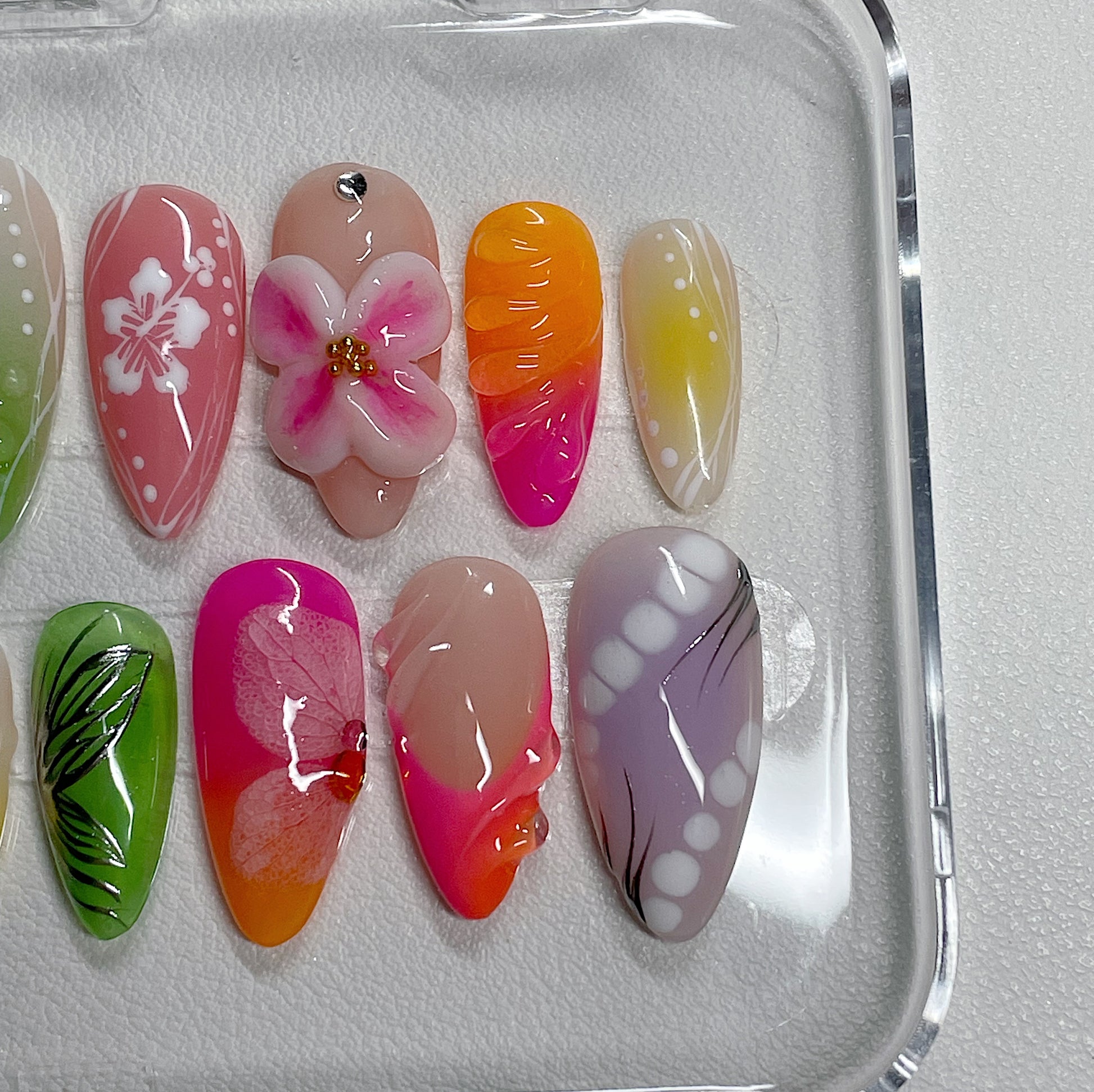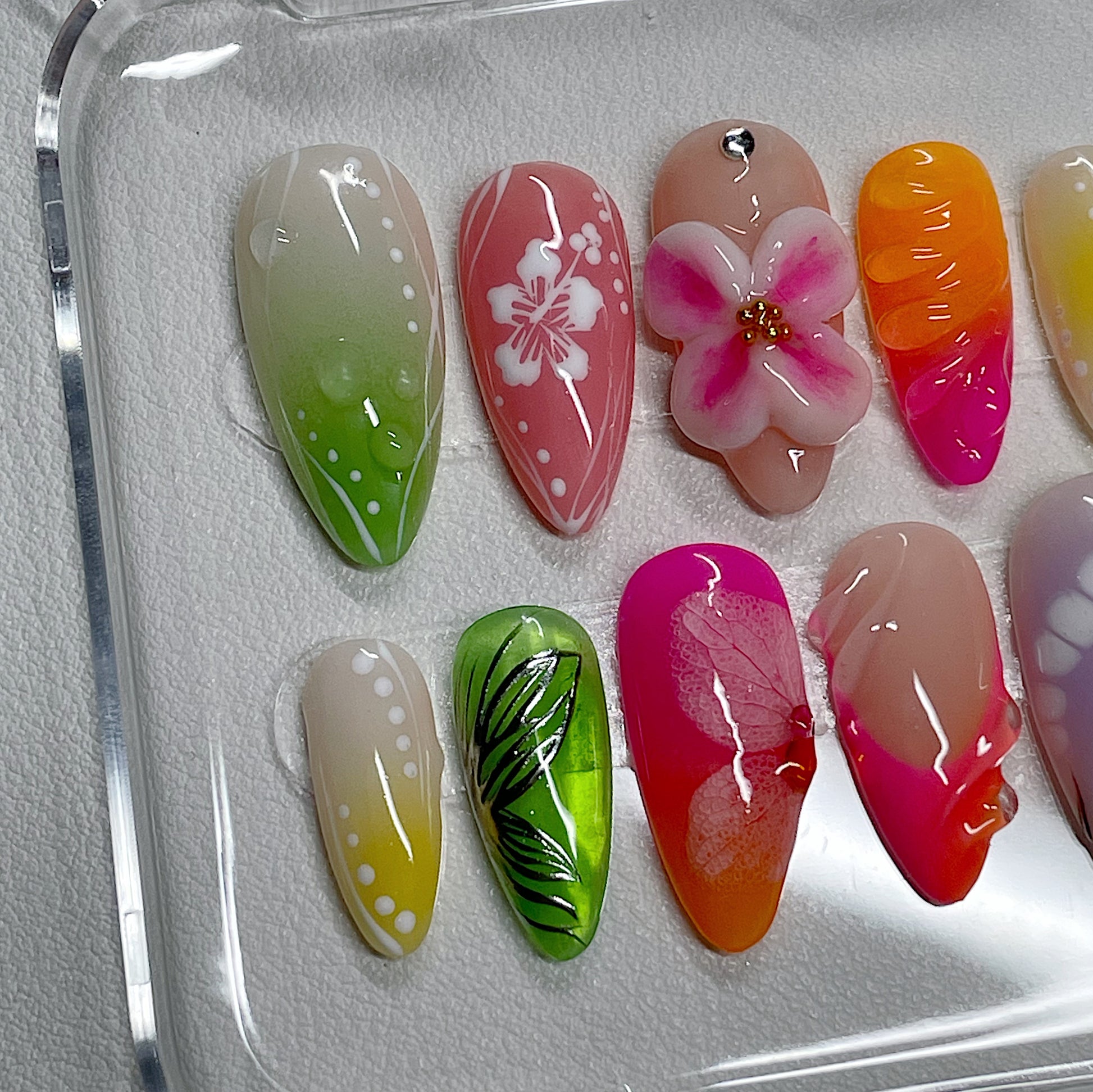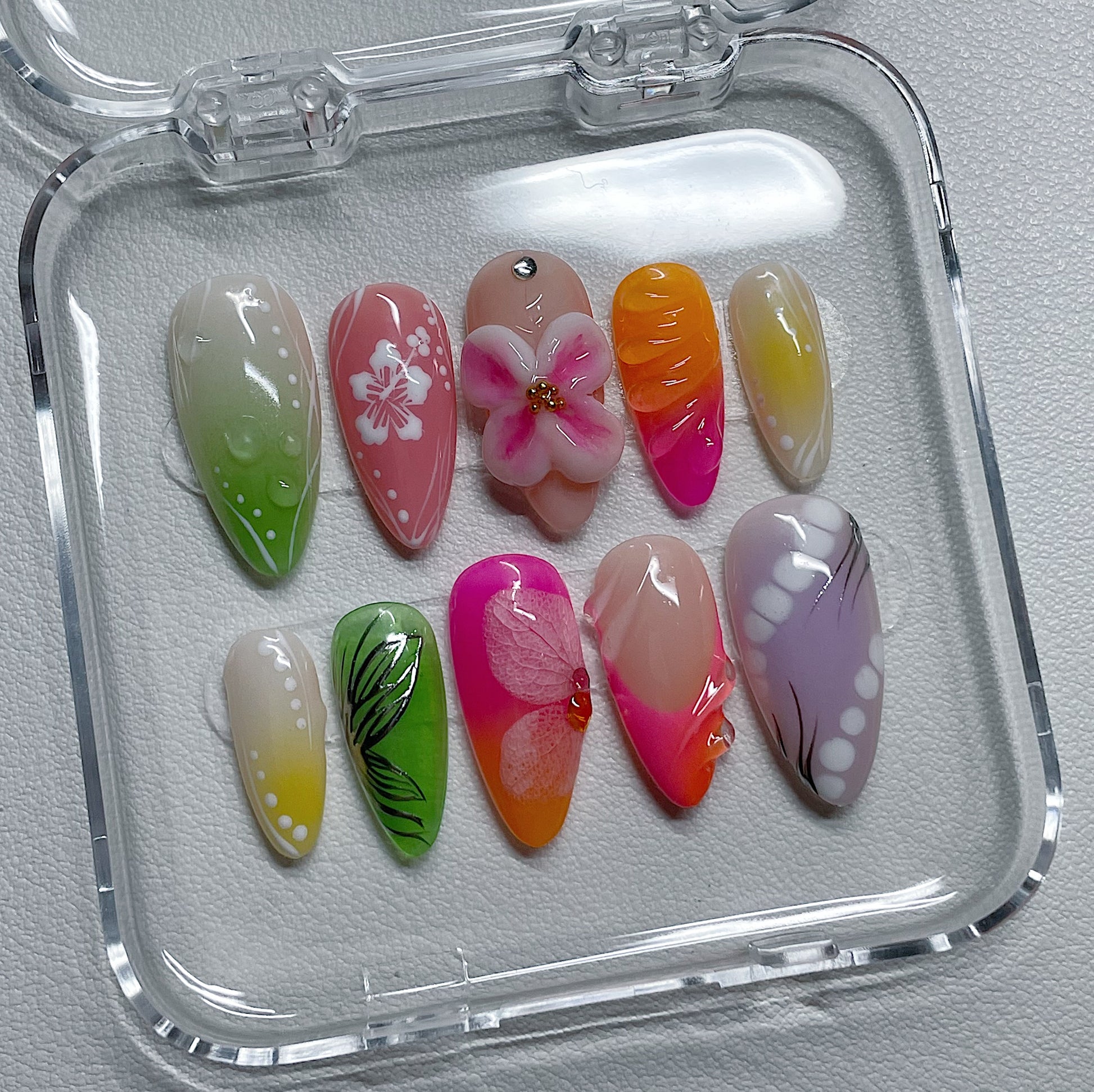 Your pressie set comes with 10 reusable press on nails as pictured, instructions on how to apply and remove your pressies, and an application kit containing everything you need for a seamless application!