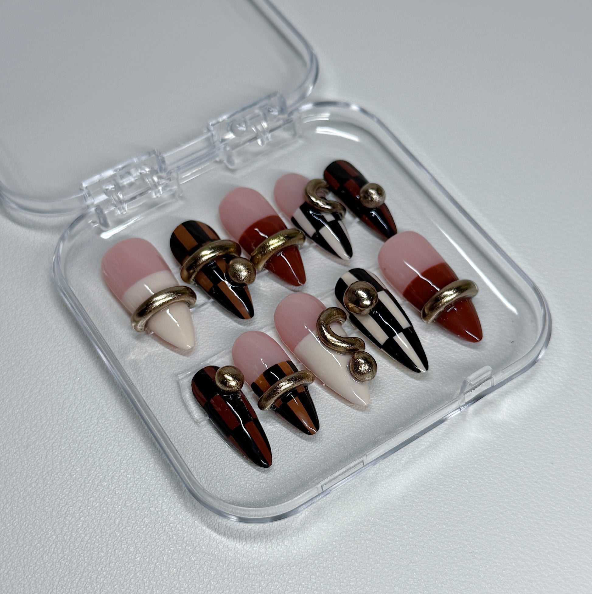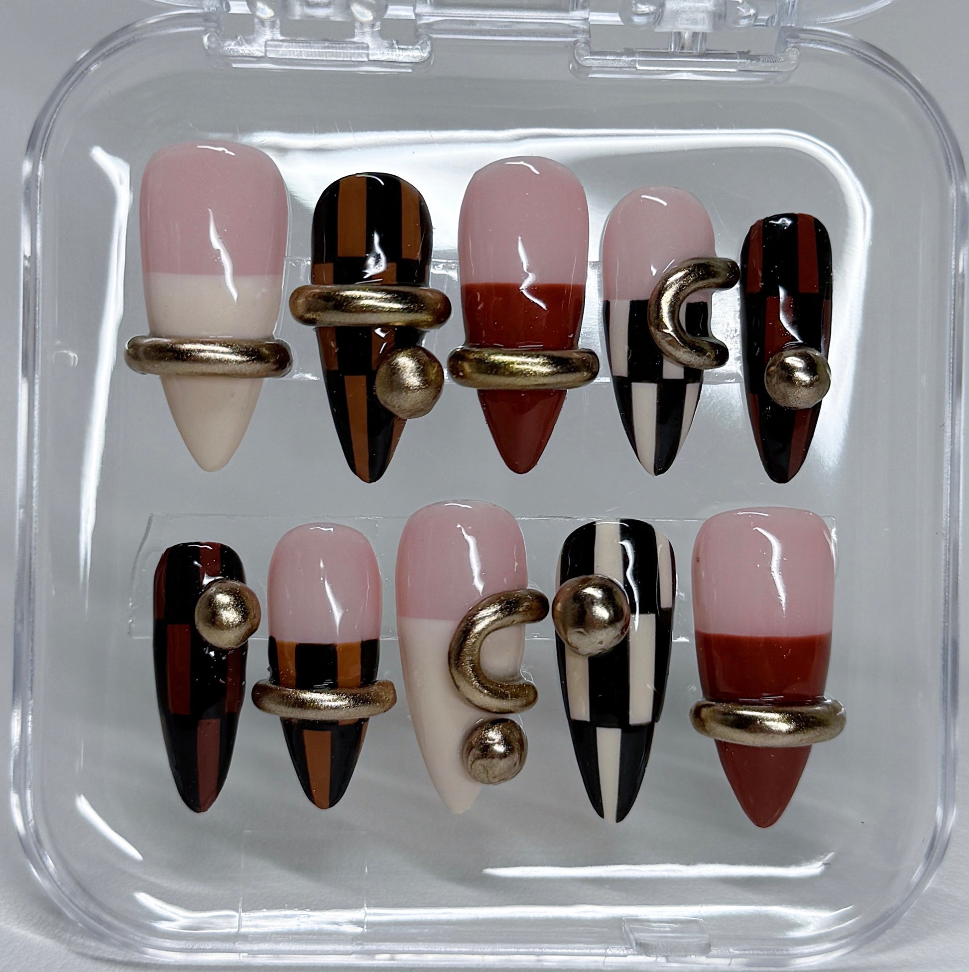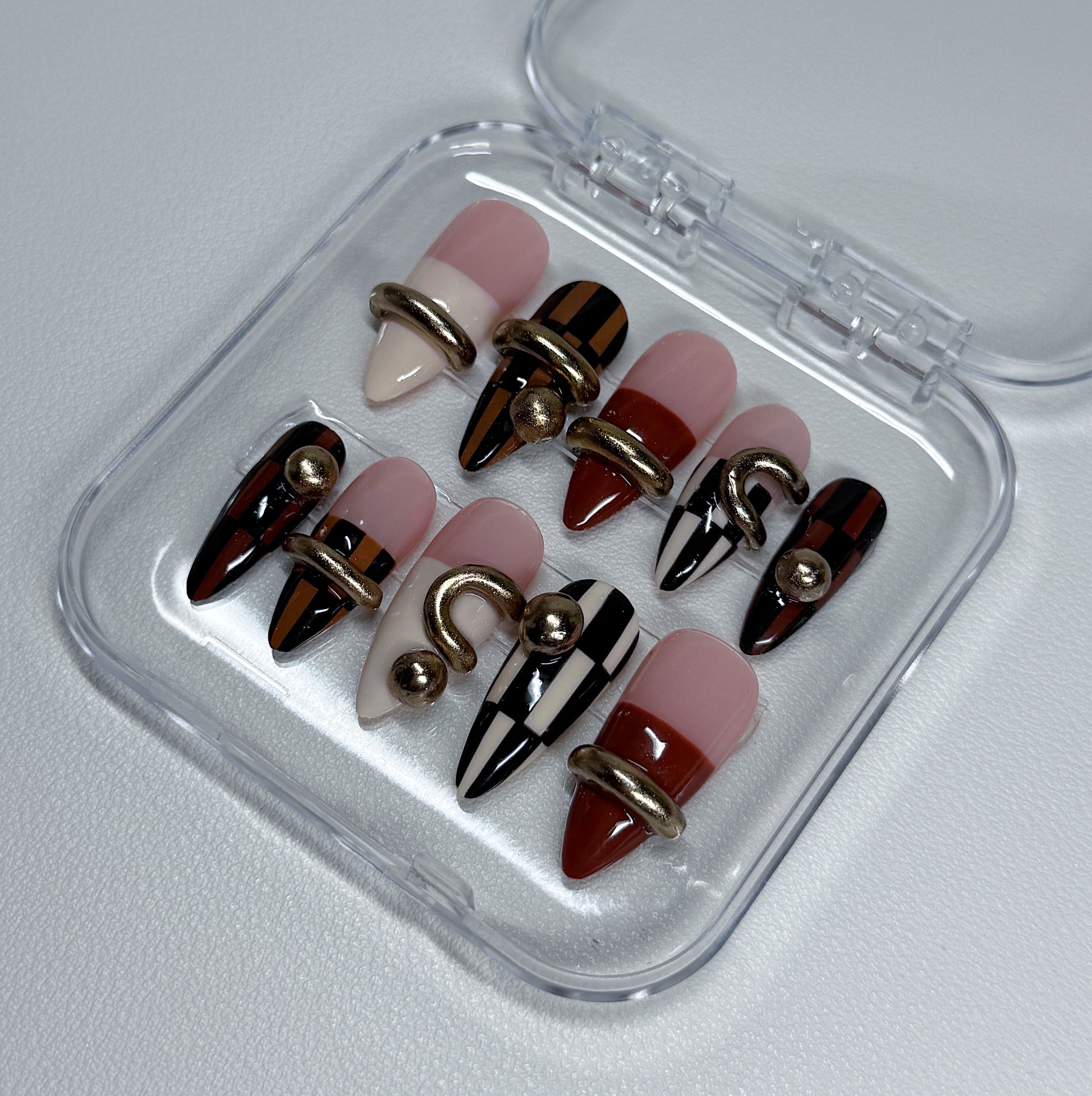 Your pressie set comes with 10 reusable press on nails as pictured, instructions on how to apply and remove your pressies, and an application kit containing everything you need for a seamless application!