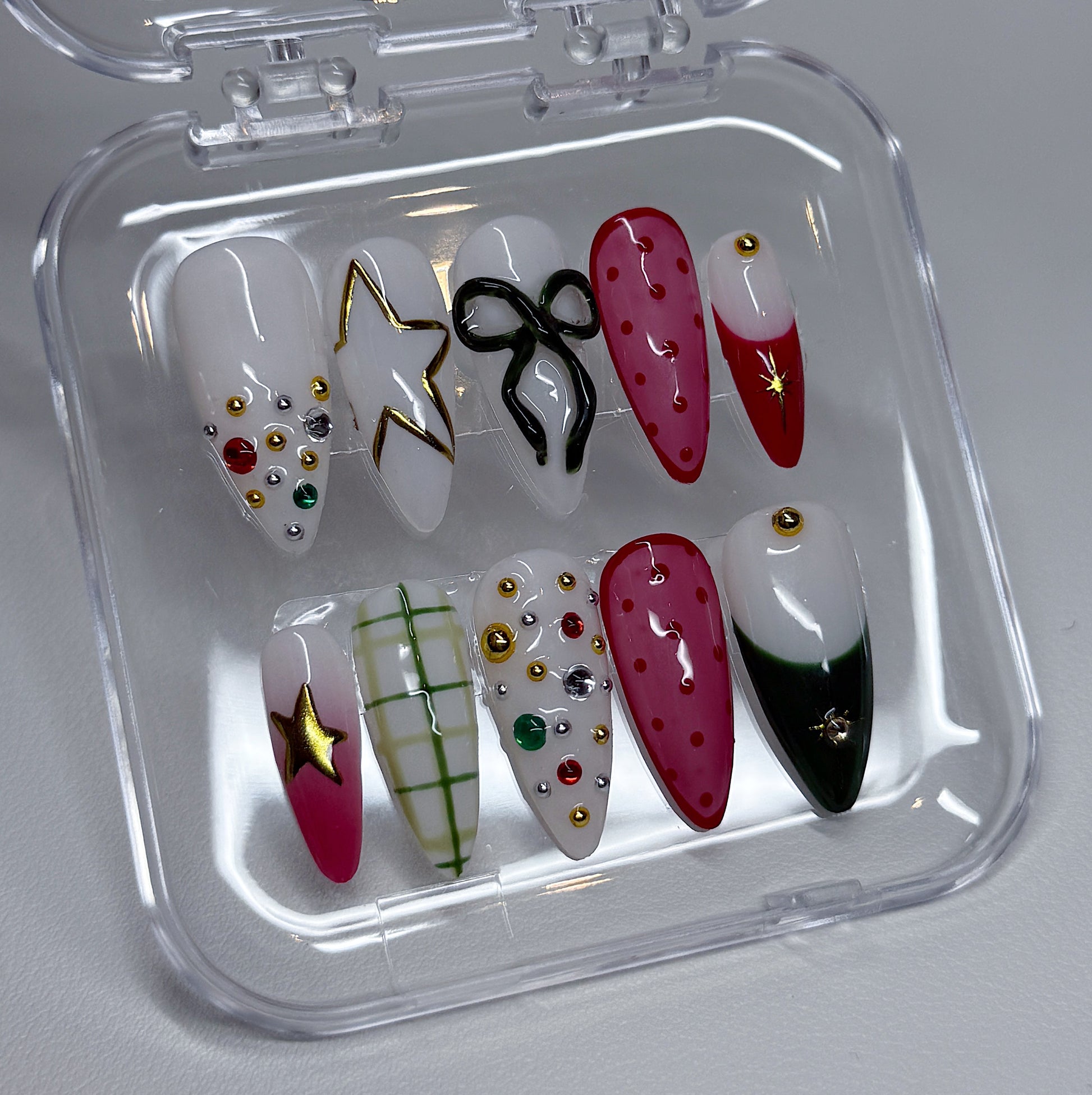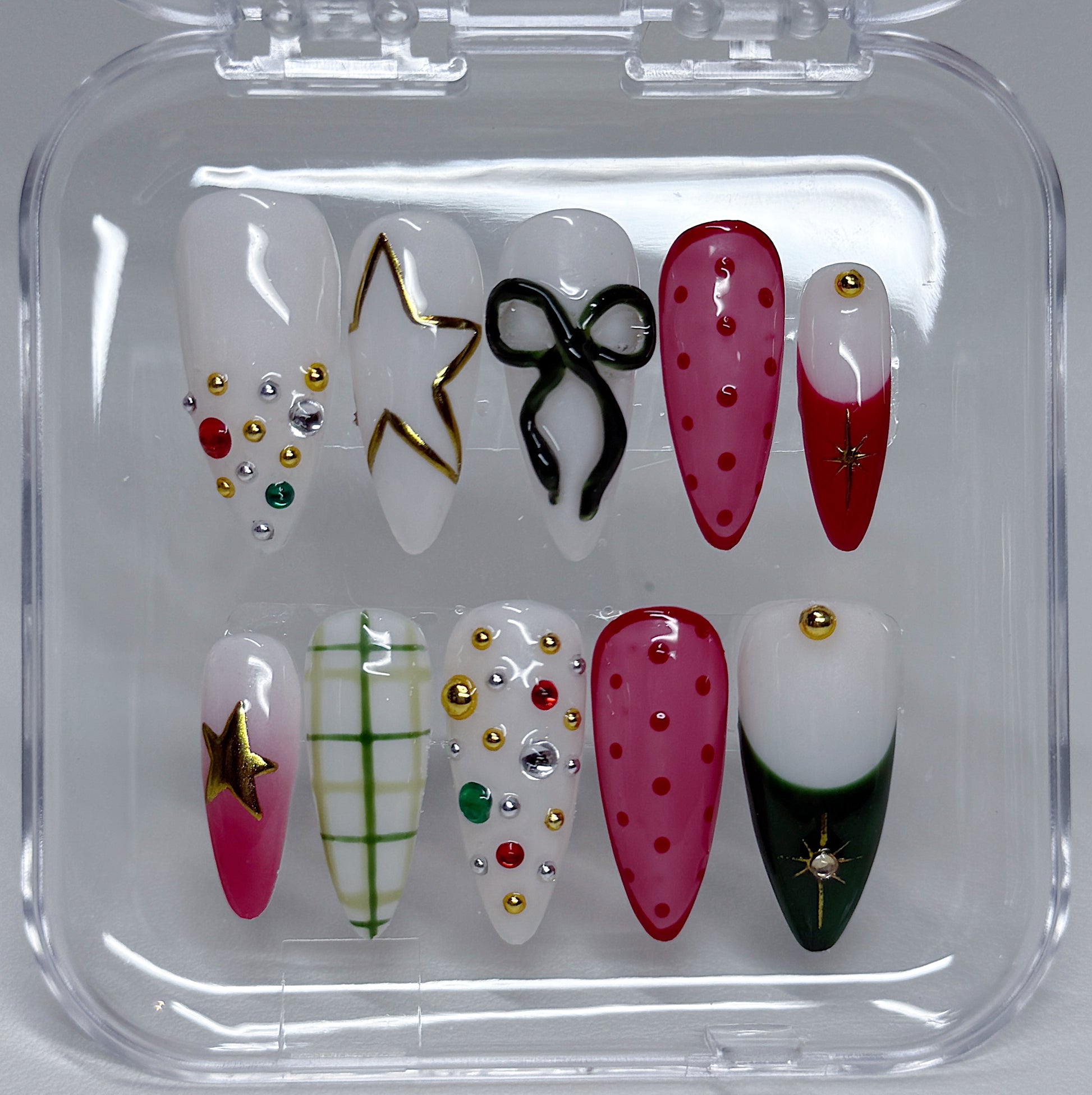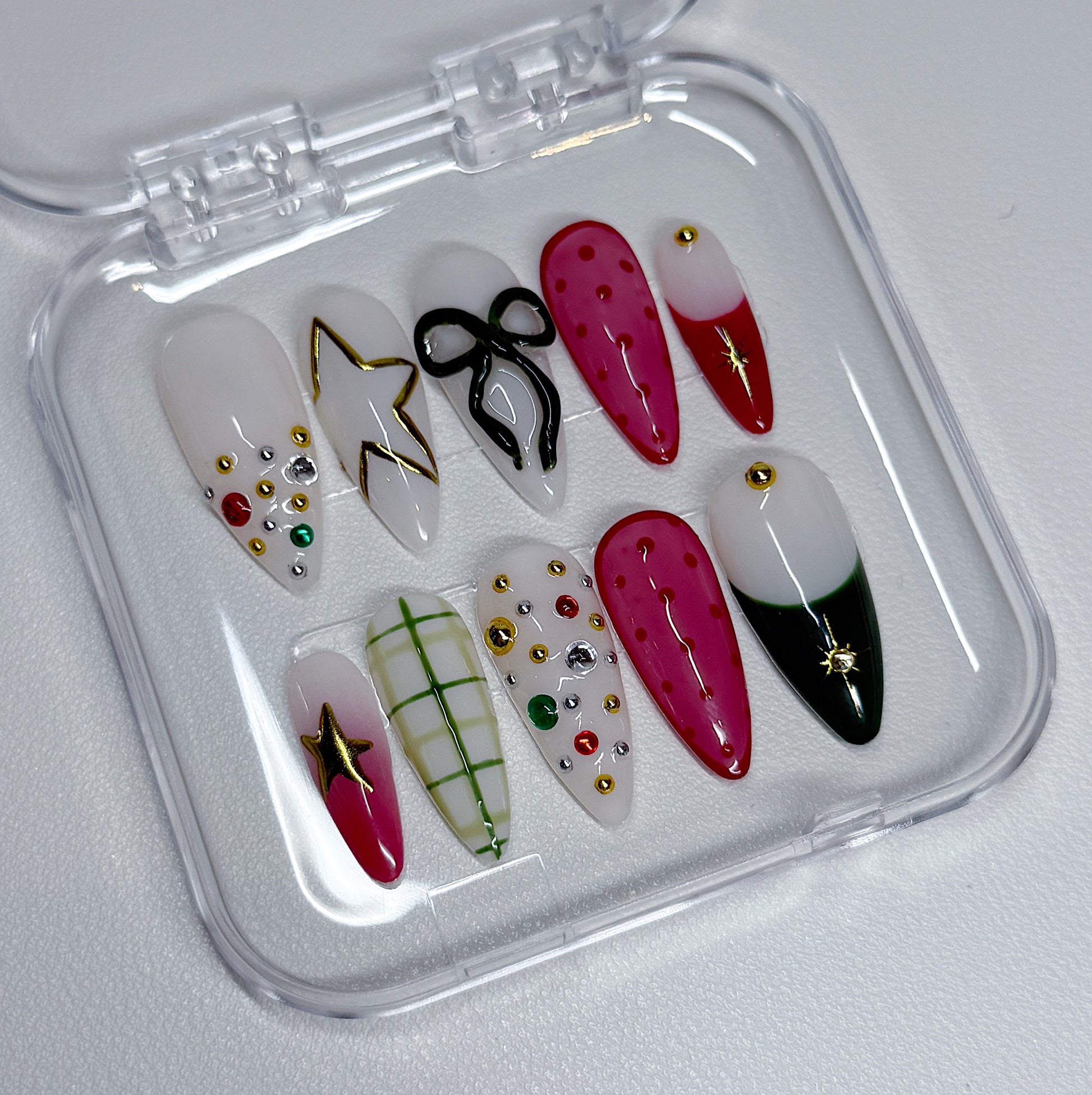 Your pressie set comes with 10 reusable press on nails as pictured, instructions on how to apply and remove your pressies, and an application kit containing everything you need for a seamless application!