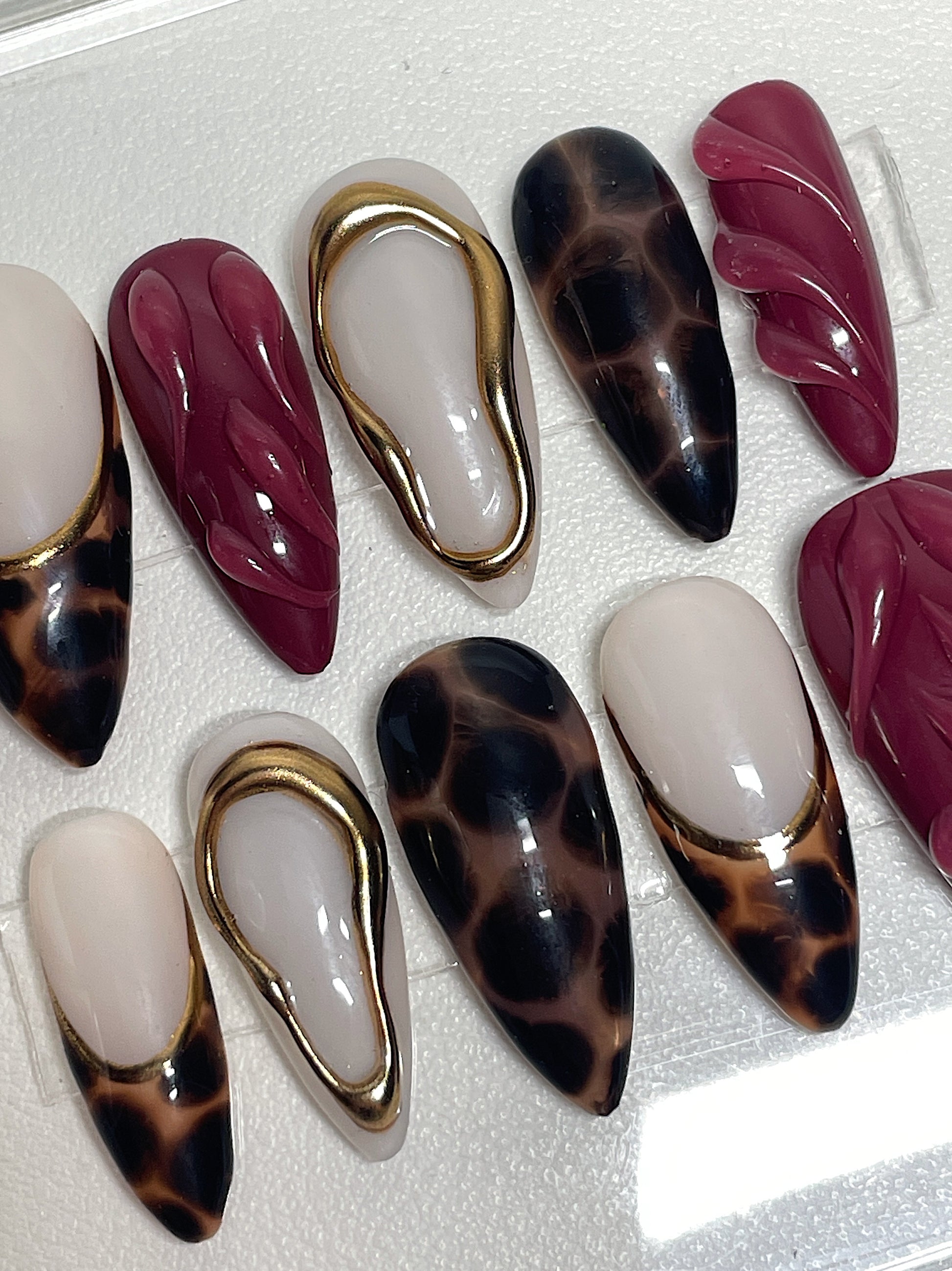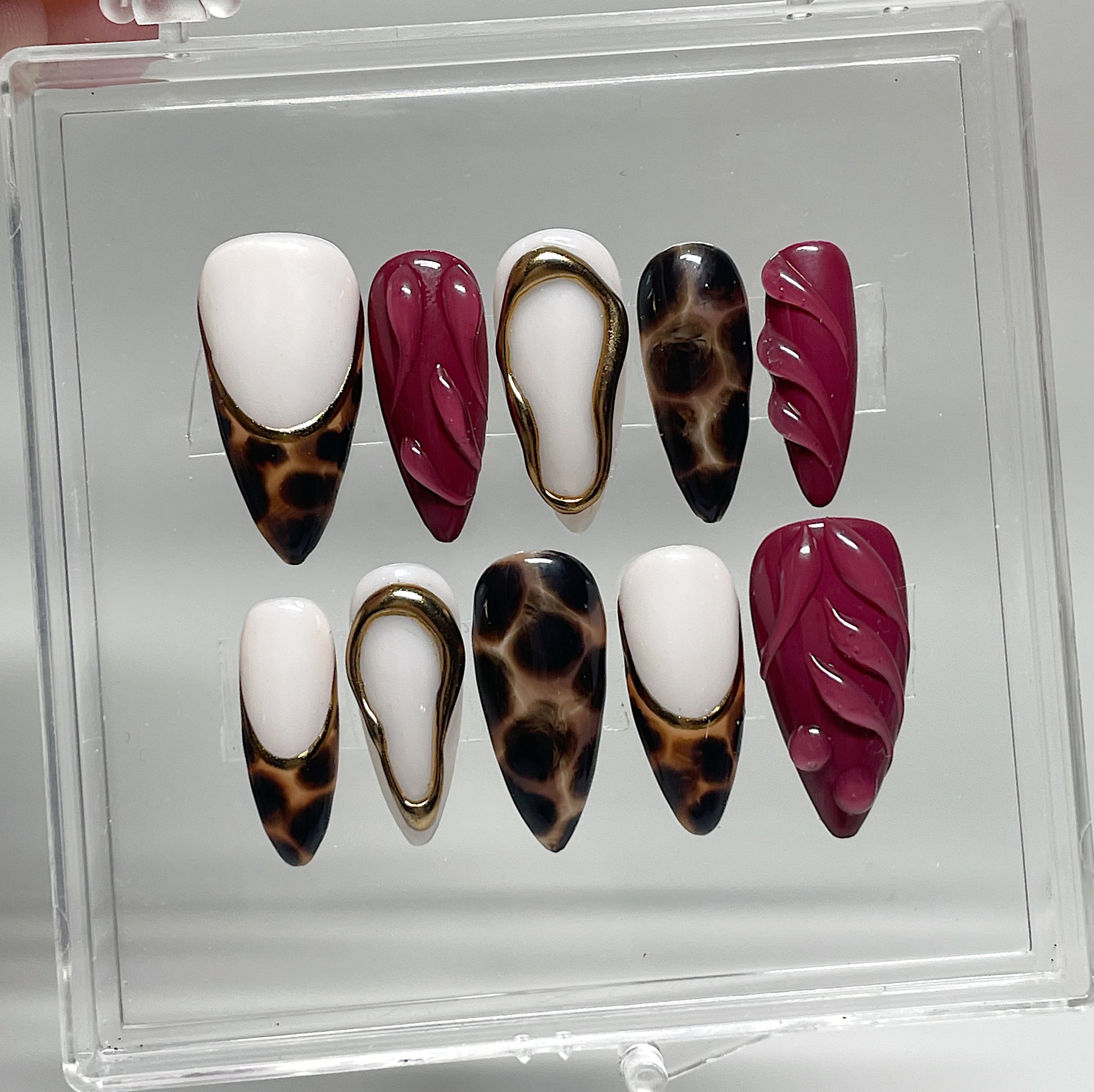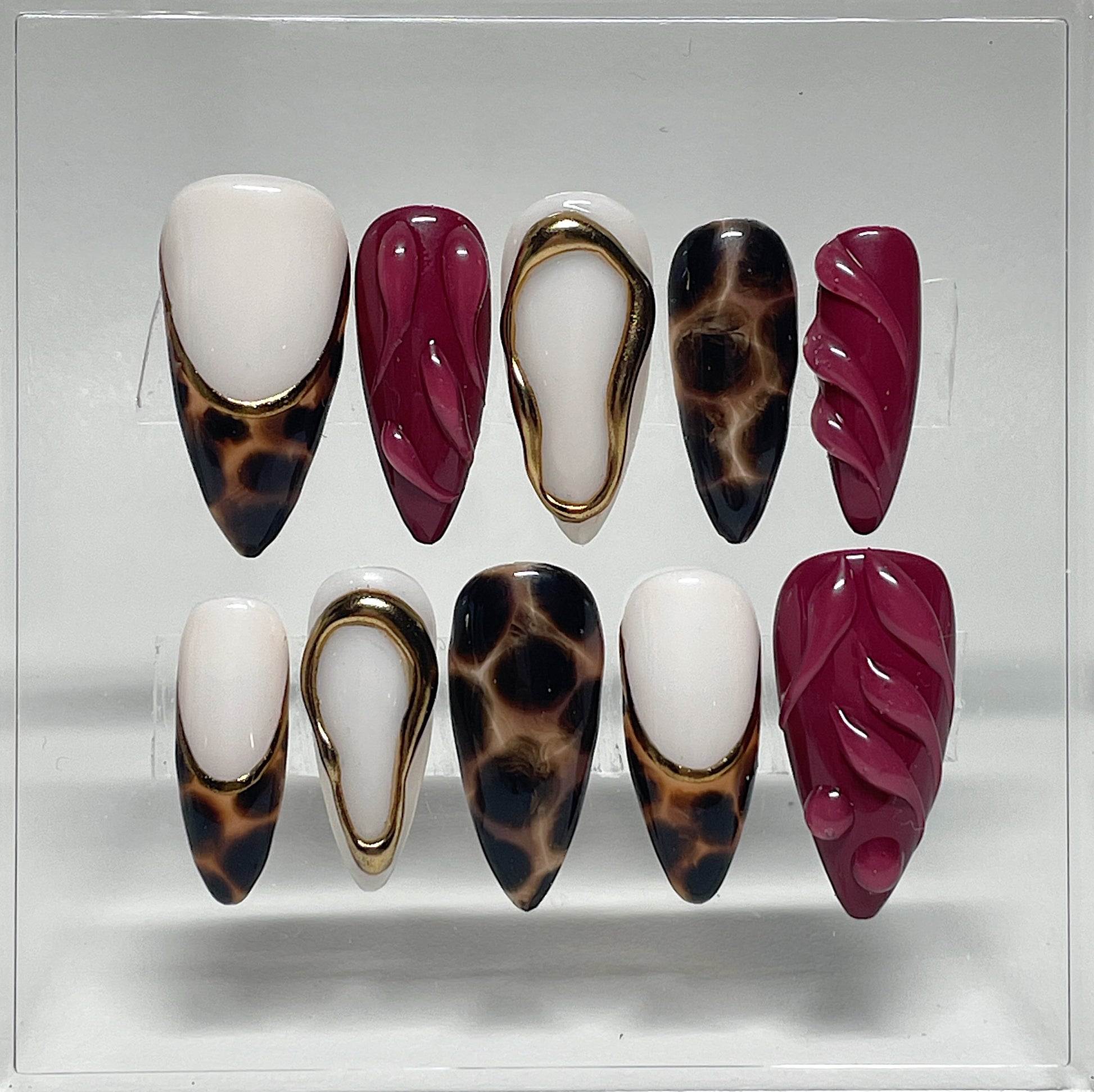 Your pressie set comes with 10 reusable press on nails as pictured, instructions on how to apply and remove your pressies, and an application kit containing everything you need for a seamless application!