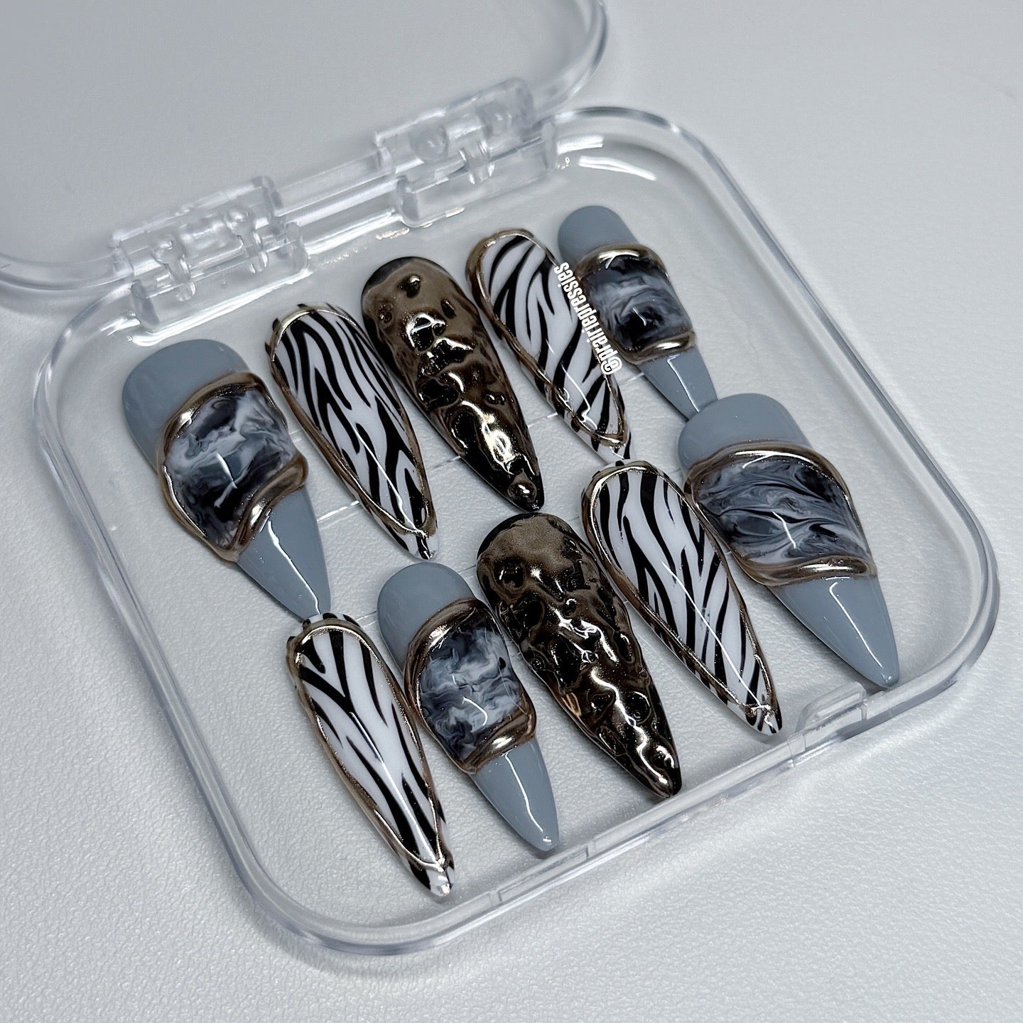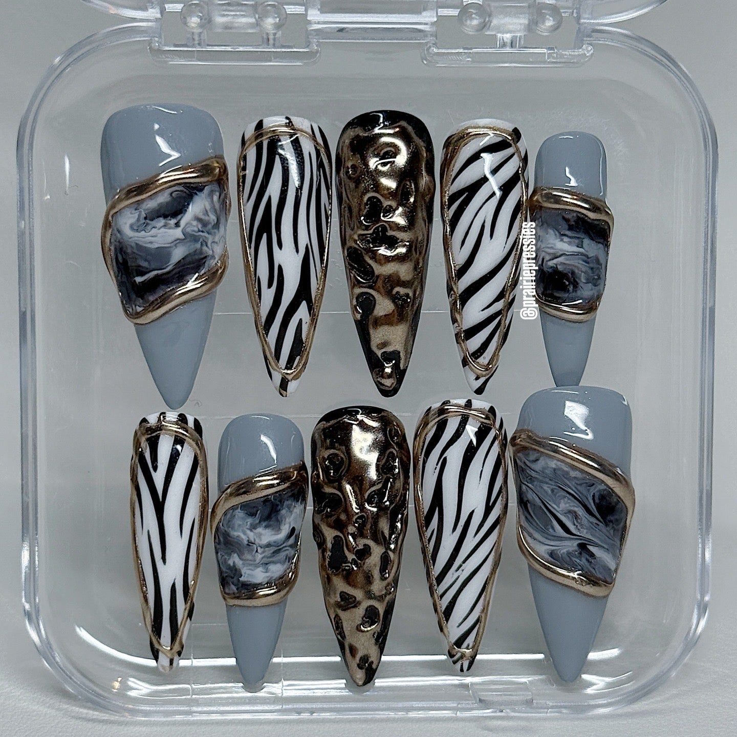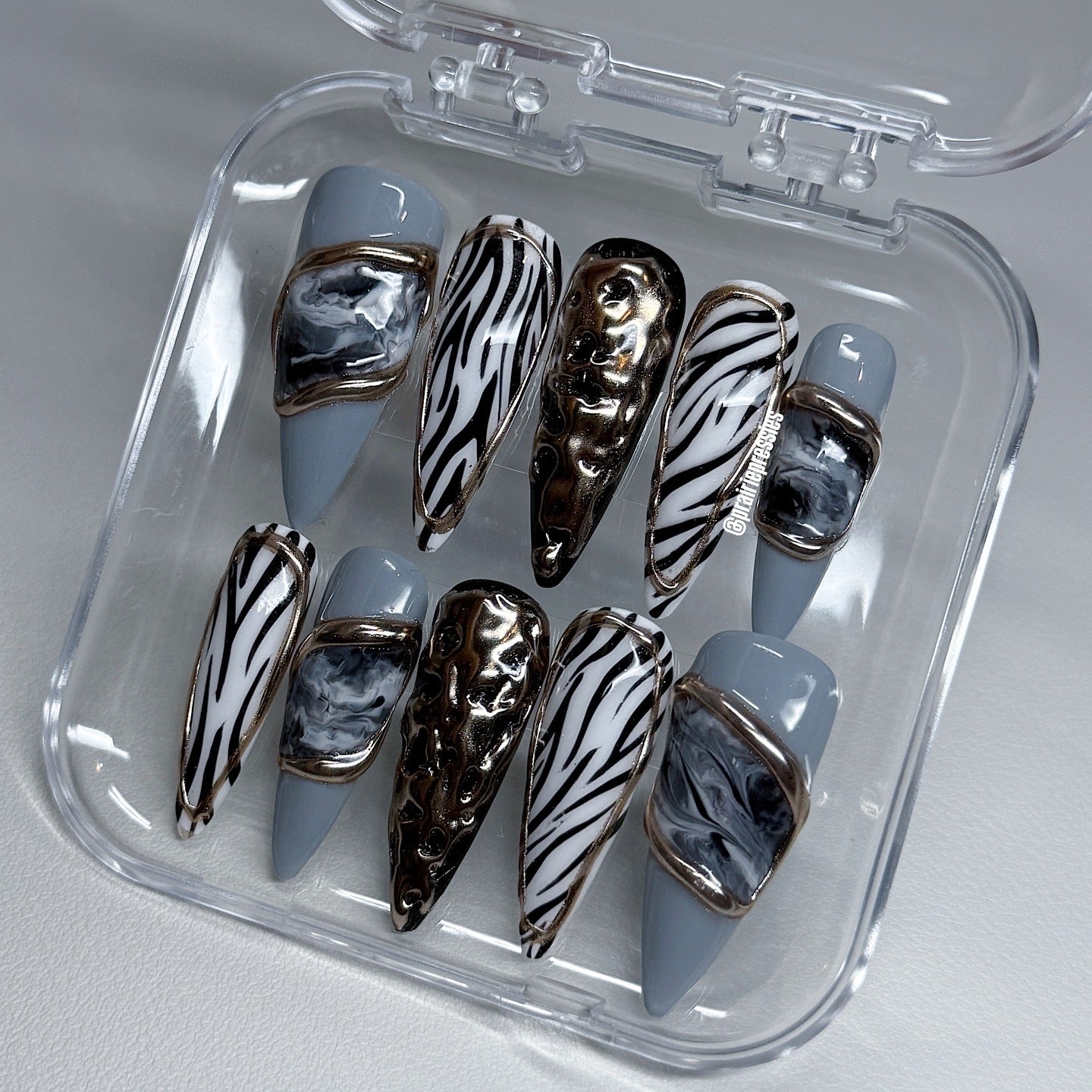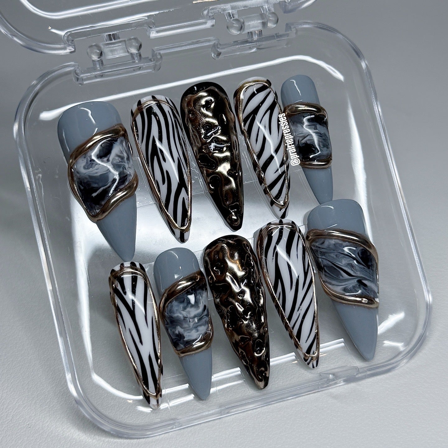 Your pressie set comes with 10 reusable press on nails as pictured, instructions on how to apply and remove your pressies, and an application kit containing everything you need for a seamless application!