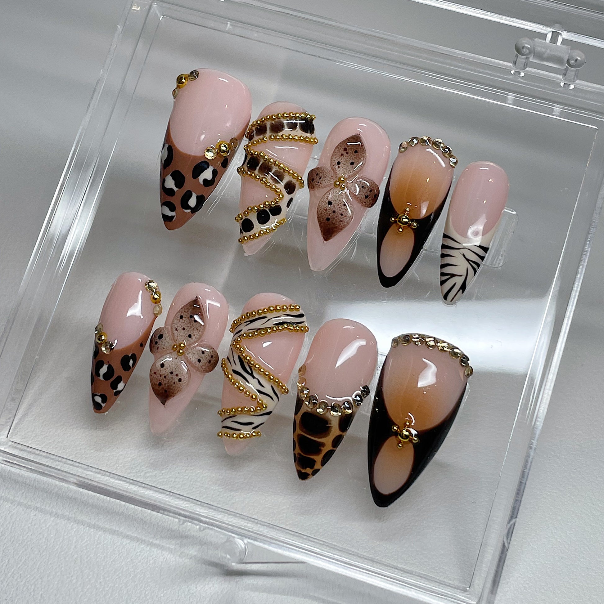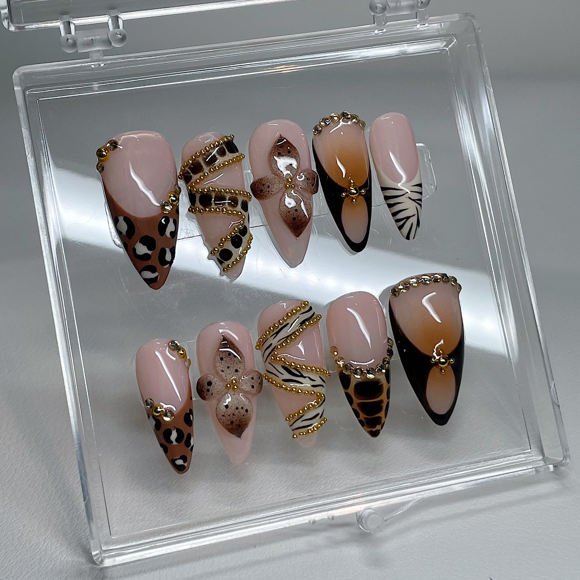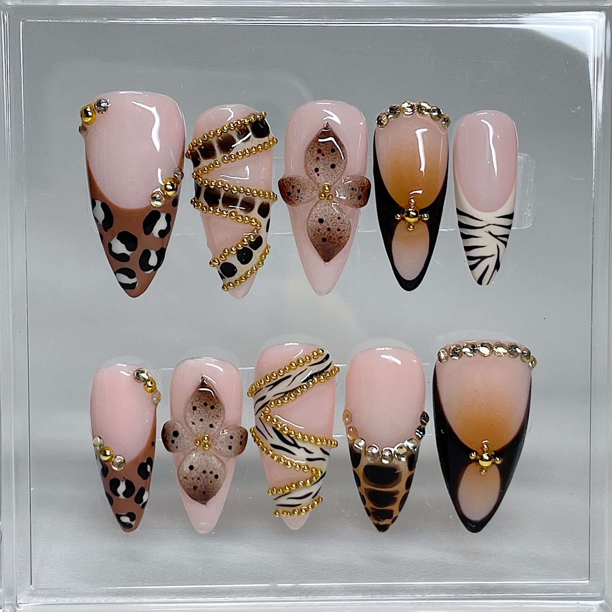 Your pressie set comes with 10 reusable press on nails as pictured, instructions on how to apply and remove your pressies, and an application kit containing everything you need for a seamless application!